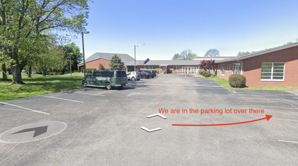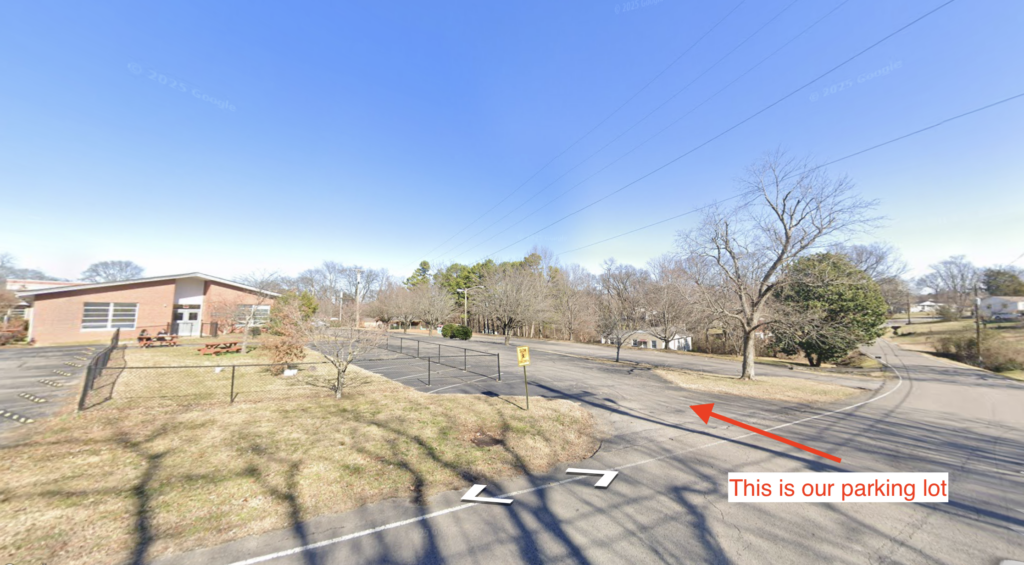 Go to the back of the 2nd parking lot. You can park in one of the angled parking spaces. Ring the electronic doorbell on the door to the gymnasium building. You’ll see our Accessible Hope sign on the door.